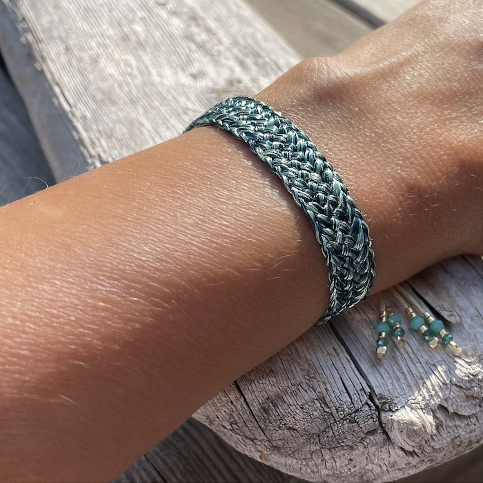 Le tissage est exécuté artisanalement et le montage du bracelet est travaillé avec des métaux précieux et des perles en Argent 925 plaquées Or pour une résistance optimale et des finitions délicates grâce aux perles de cristal qui soulignent les nuances du tissage.