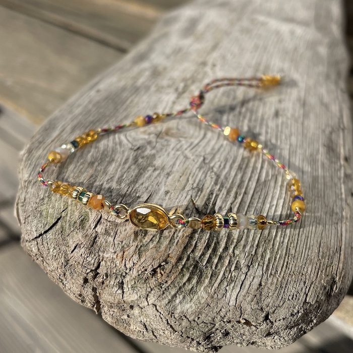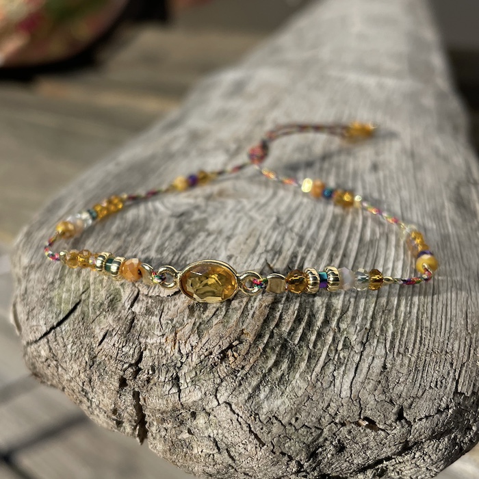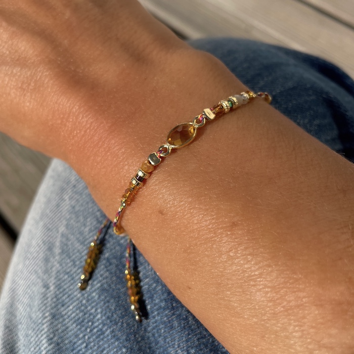 Bracelet agrémenté d’une calcédoine jaune, pierre fine sertie en Argent 925 plaqué Or, de perles fines , de perles de cristal et de perles en Argent 925 plaquées Or.