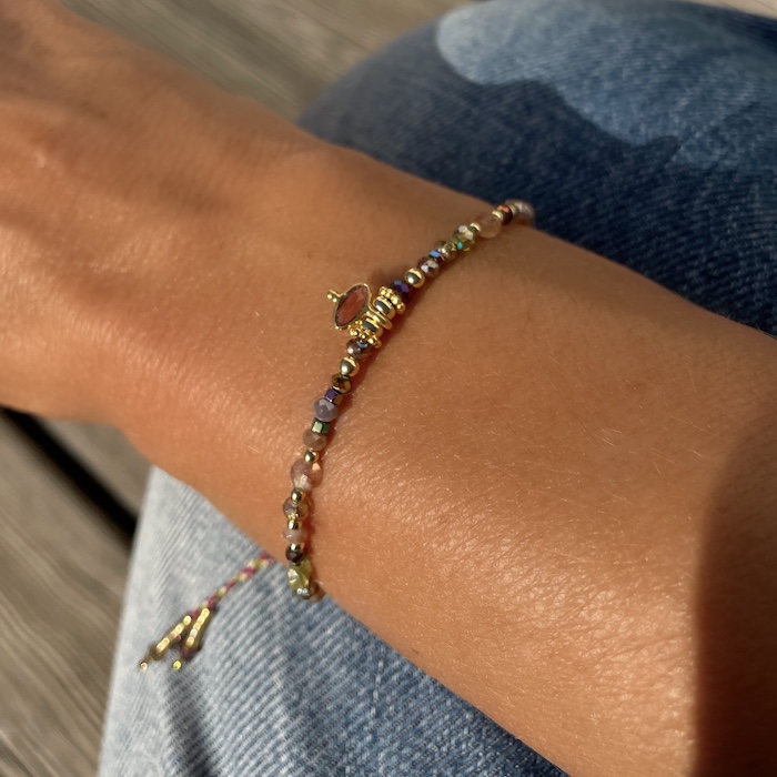Le bracelet est ajustable grâce aux cordons coulissants et se glisse facilement autour du poignet. Agrémenté de perles en Argent9 25 plaquées Or et de perles de cristal, ses finitions sont délicates et raffinées.
