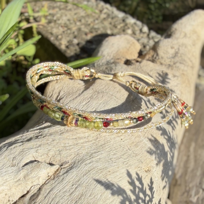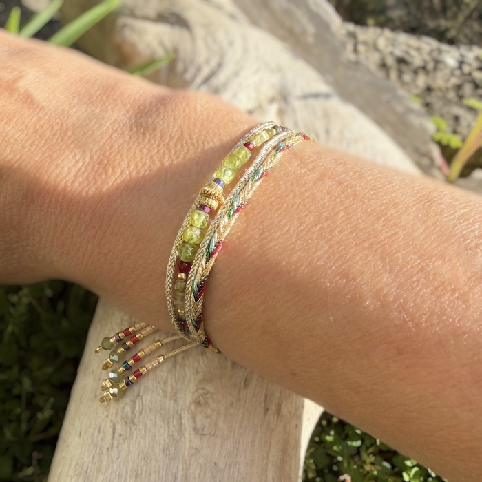 Le bracelet est ajustable grâce aux cordons coulissants et se glisse facilement autour du poignet. Ses finitions délicates grâce aux perles en Argent 925 plaquées Or et aux perles de cristal soulignent les nuances des couleurs du bracelet.