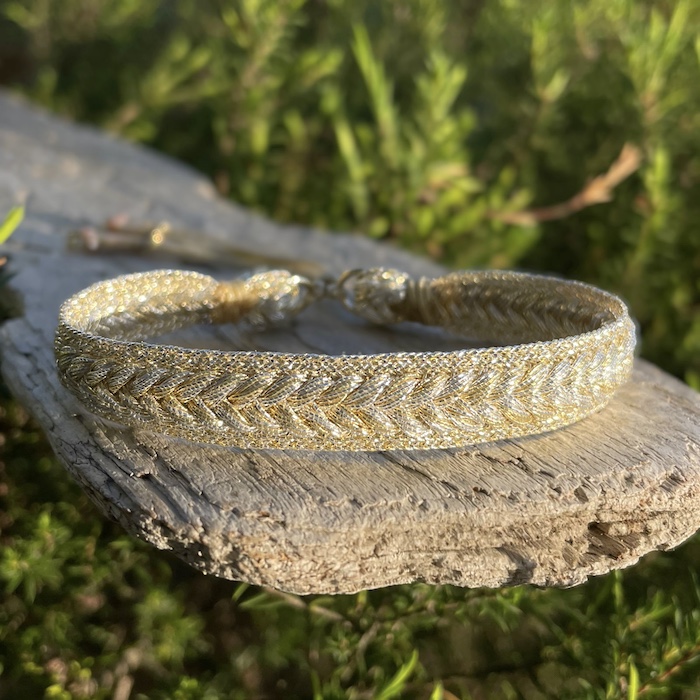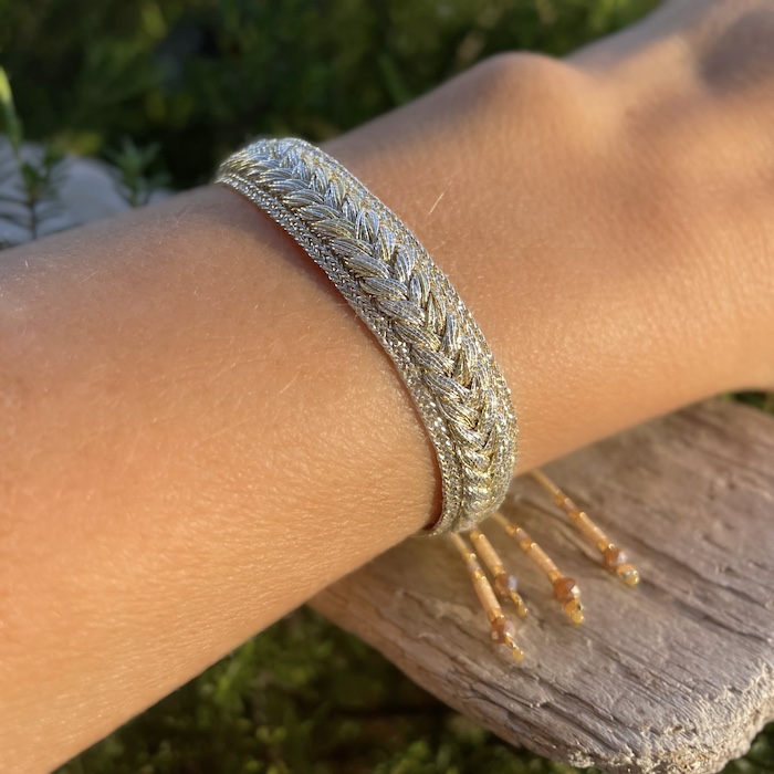 Le tissage est exécuté artisanalement et le montage du bracelet est travaillé avec des métaux précieux et des perles en Argent 925 plaquées Or pour une résistance optimale et des finitions délicates grâce aux perles qui soulignent les nuances du tissage.