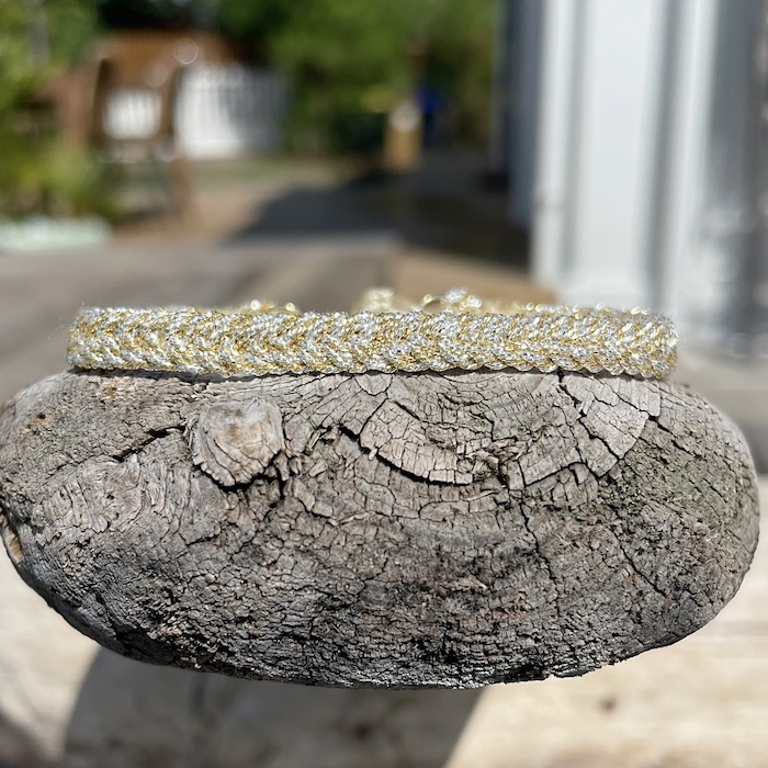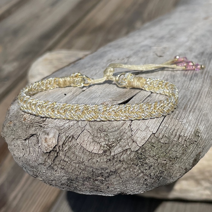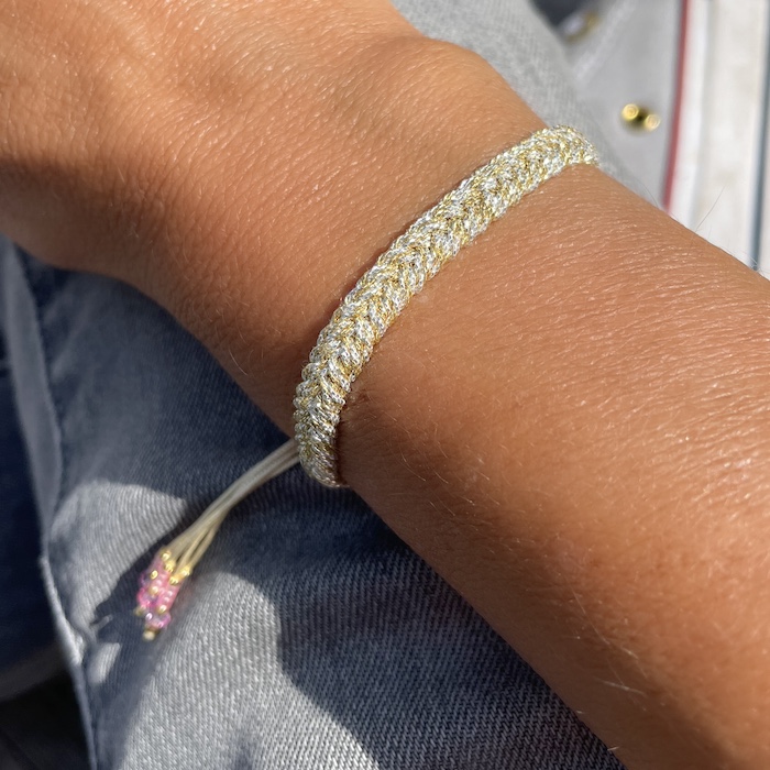Le tissage est exécuté artisanalement et le montage du bracelet est travaillé avec des métaux précieux et des perles en Argent 925 plaquées Or pour une résistance optimale et des finitions délicates grâce aux perles qui soulignent les nuances du tissage.
