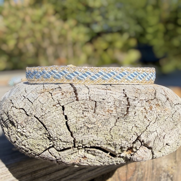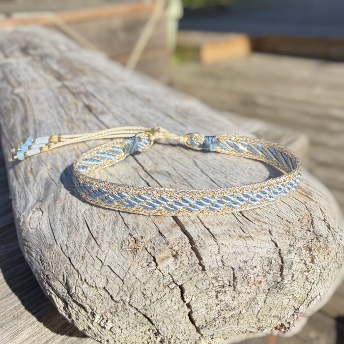 Bracelet tissé en fils de soie or, argent et bleu pâle.