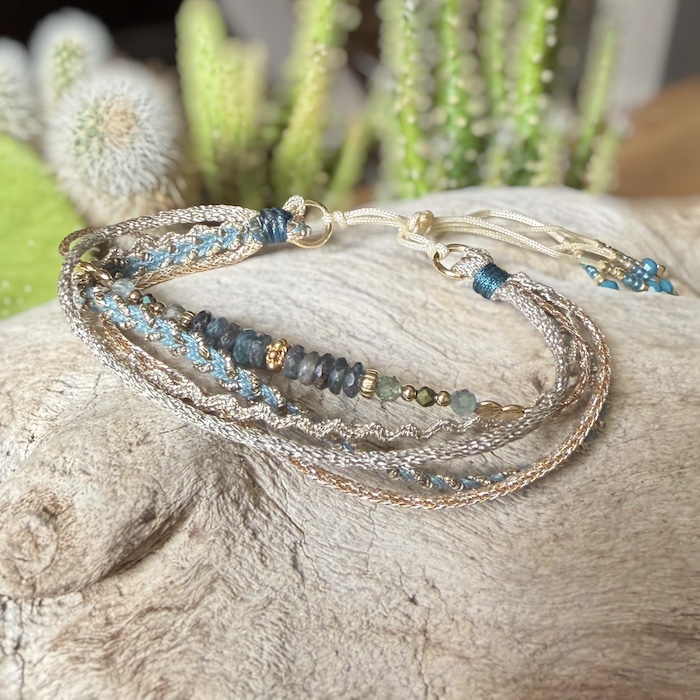 Bracelet manchette quadruple rangs composé de pierres fines en iolite, de perles en Argent925 plaquées Or jaune, ainsi que deux rubans de passementerie et un cordons en fils de soie tressés.