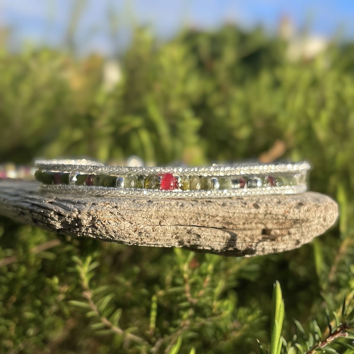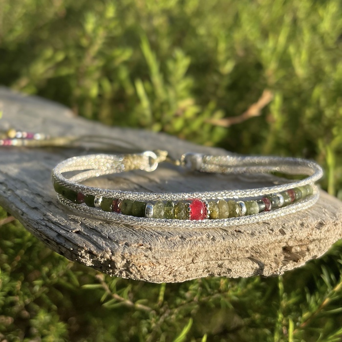 Le bracelet est ajustable grâce aux cordons coulissants et se glisse facilement autour du poignet. Ses finitions délicates grâce aux perles en Argent925 et aux perles de cristal soulignent les nuances des couleurs du bracelet.