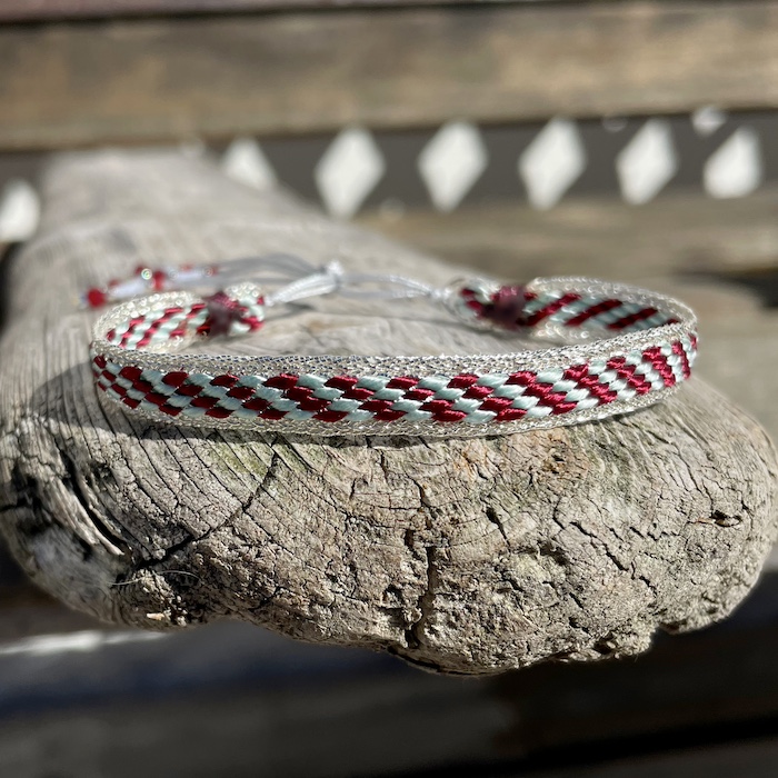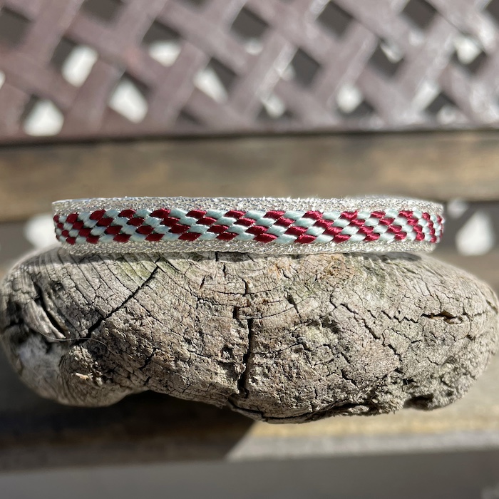 Bracelet tissé en fils de soie argent, bordeaux et bleu pâle.