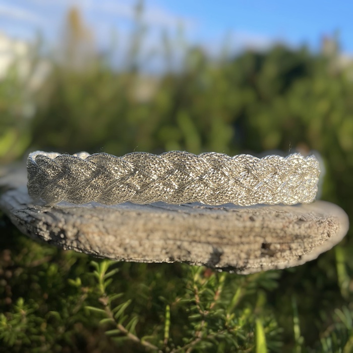 Bracelet tissé en fils de soie argent.