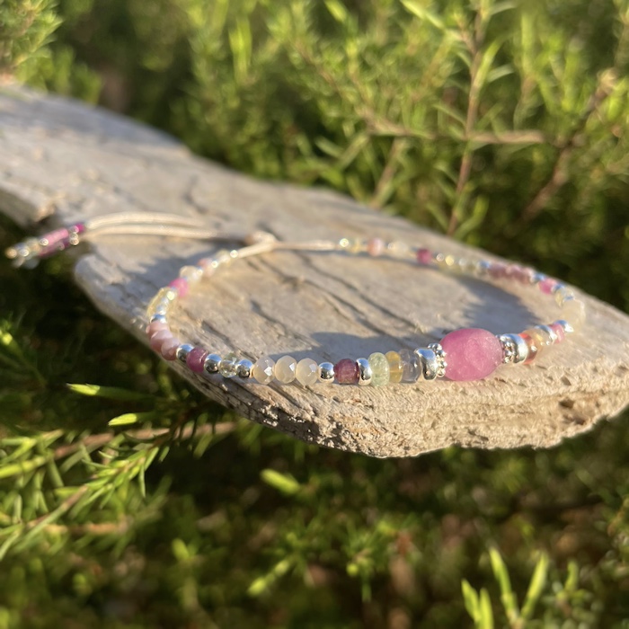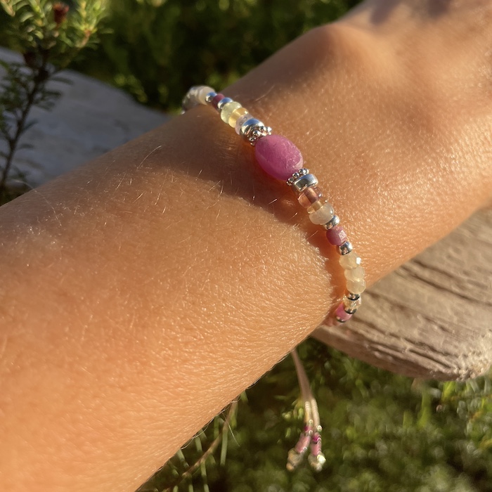 Le bracelet est ajustable grâce aux cordons coulissants et se glisse facilement autour du poignet. Ses finitions délicates grâce aux perles en Argent925 et aux perles de cristal soulignent les nuances des couleurs du bracelet.