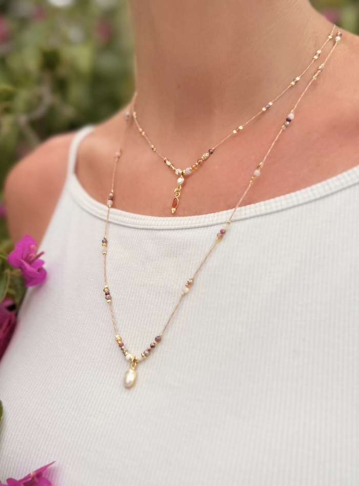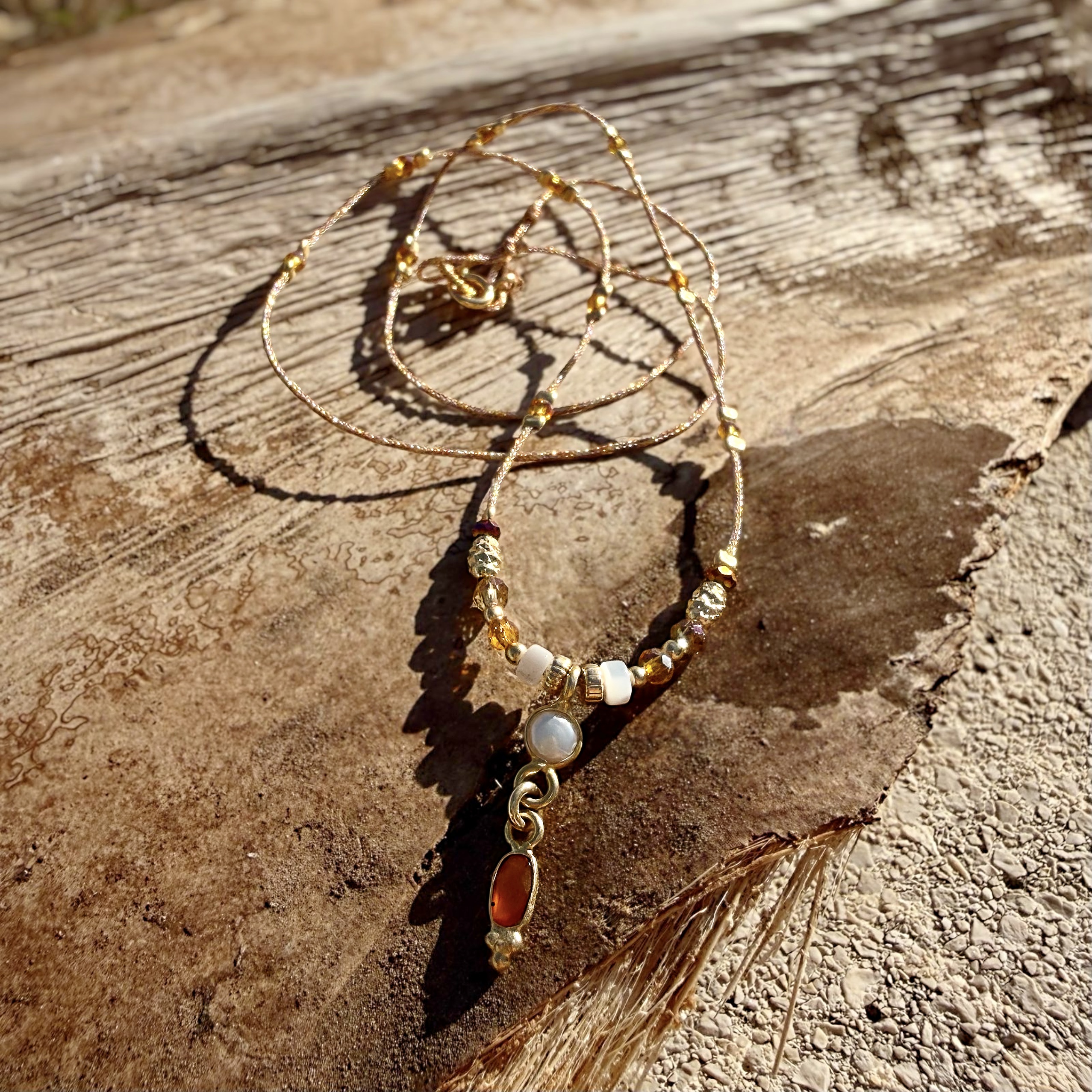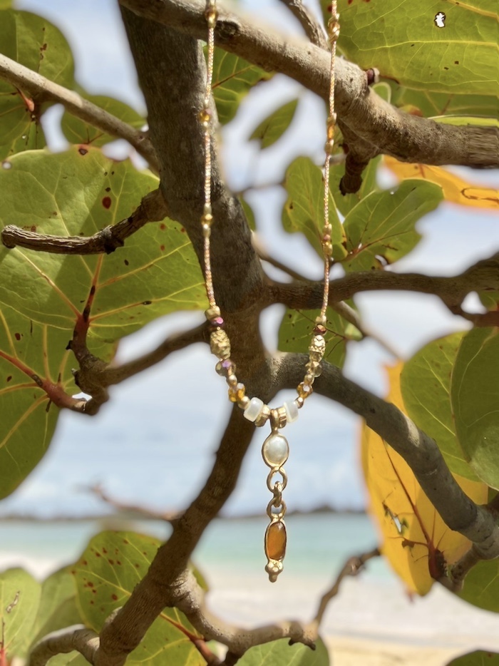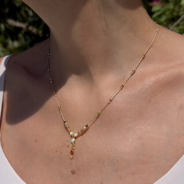 Collier agrémenté d’une perle d’eau douce et d’une calcédoine jaune, pierres fines serties en Argent 925 plaquées Or, de perles de cristal et de perles en Argent 925 plaquées Or.