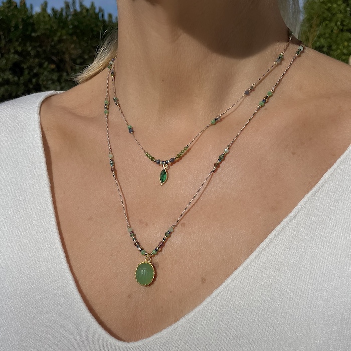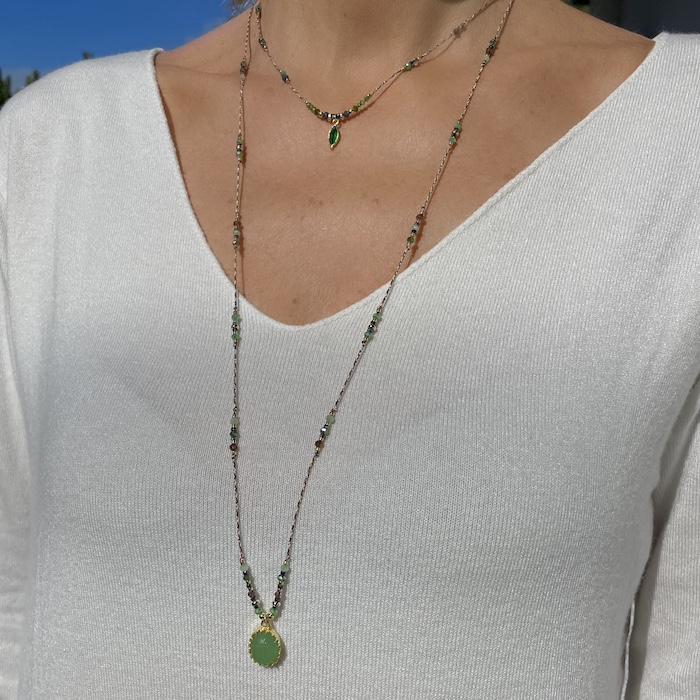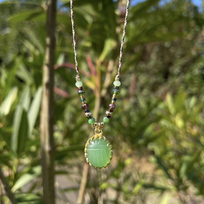 Collier composé d’un scarabée en chrysoprase, de perles de cristal, de perles de Miyuki et de perles en Argent 925 plaquées Or sur un cordon réglable jusqu’a 85 cm de longueur. Facile à régler, on peut le porter court ou long jusqu’à 85 cm de longueur en fonction de ses tenues.