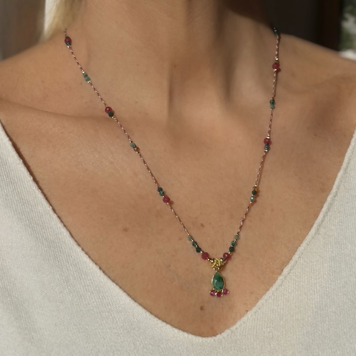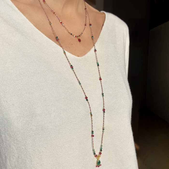 A porter en ras de cou ou en sautoir, ce modèle s’adapte à toute vos tenues grâce aux cordons ajustables dans le dos. Ses finitions délicates grâce aux perles en Argent 925 plaquées Or et aux perles de cristal soulignent les nuances des couleurs du collier.