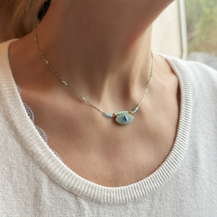 Collier agrémenté d’une amazonite, pierre fine sertie en Argent 925 plaquée Or, de perles de cristal et de perles en Argent 925 plaquées Or.