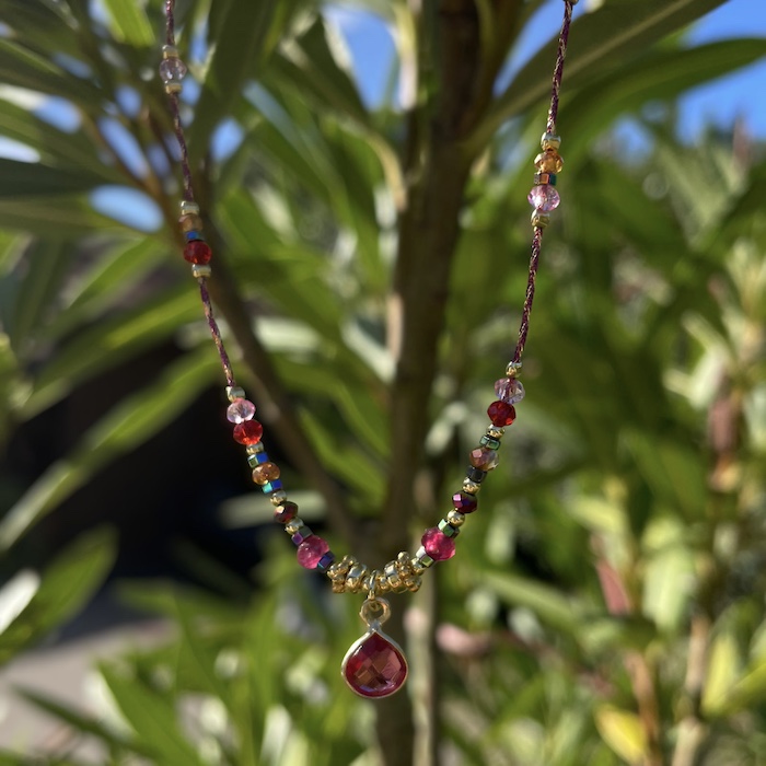 A porter en ras de cou ou en collier, ce modèle s’adapte à toute vos tenues grâce aux cordons ajustables dans le dos. Ses finitions délicates grâce aux perles en Argent 925 plaquées Or et aux perles de cristal soulignent les nuances des couleurs du collier.