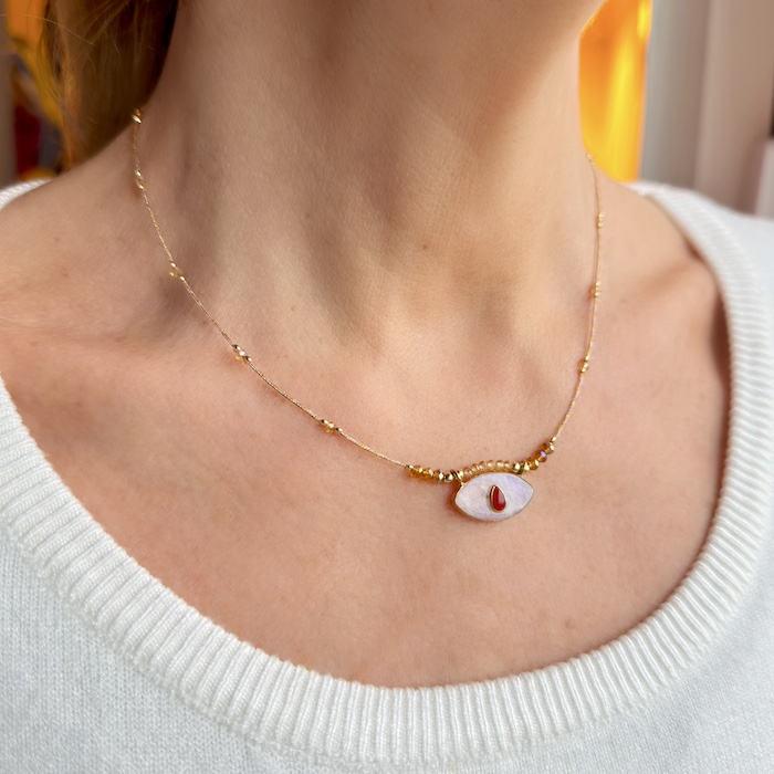 Collier agrémenté d’une pierre de lune, pierre fine sertie en Argent 925 plaquée Or, de perles de cristal et de perles en Argent 925 plaquées Or.