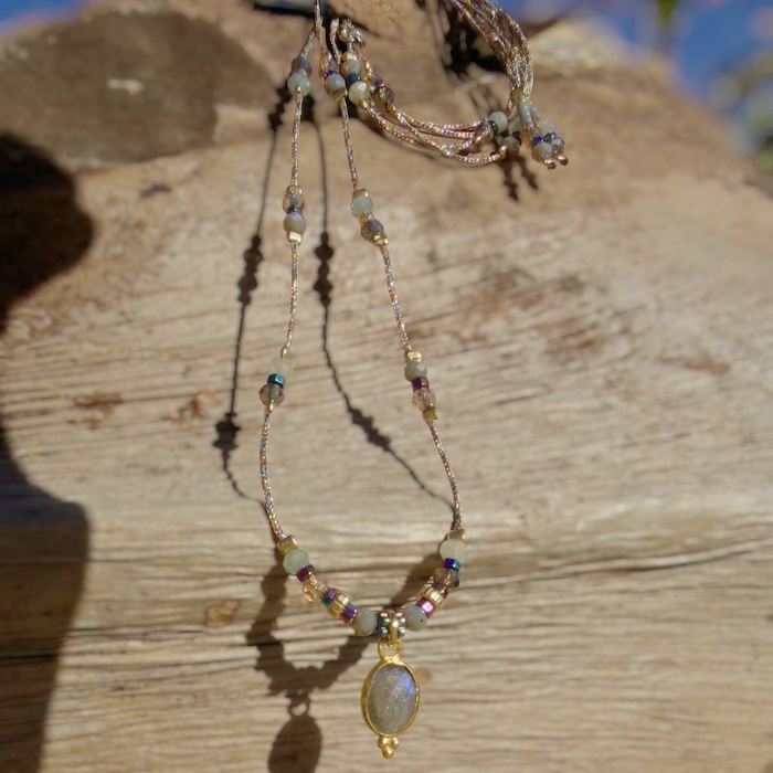 • Labradorite (pierre grise) : pierre régénératrice de protection et de développement. Elle transforme les énergies négatives en positives et permet de se ressourcer.