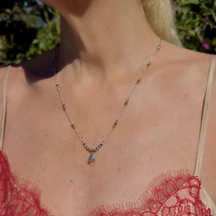 Collier sautoir agrémenté d’une pierre en labradorite sertie en Argent 925 plaquée Or, de perles de cristal et de perles en Argent 925 plaquées Or.